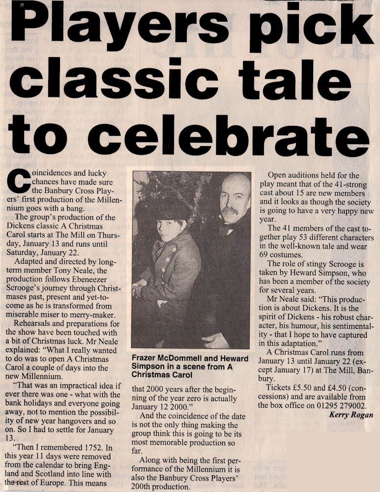 Banbury Cross Players presented A Christmas Carol by Charles Dickens at The Mill Theatre from 13th to 22nd January 2000. Adapted for the stage and Directed by Tony Neale. The Cast was as follows:-