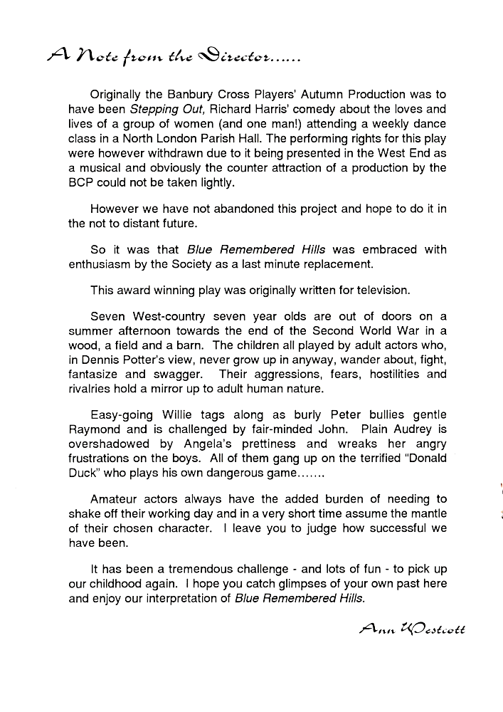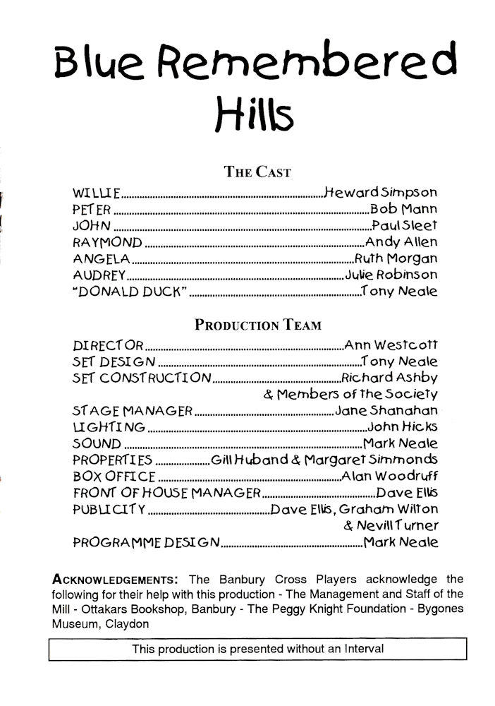 Banbury Cross PLayers performed Blue Remembered Hills in November 1977 at The Mill Arts Centre, Banbury.