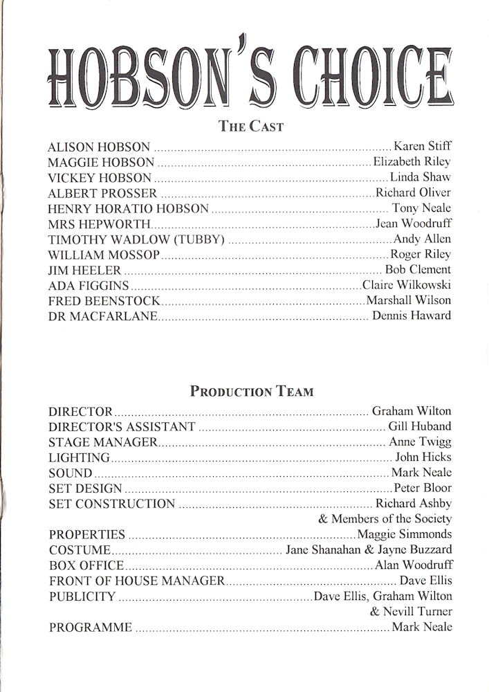 Banbury Cross Players performed Hobsons Choice by Harold Brighouse at The Mill Arts Centre in April 1997. The Cast was as follows: