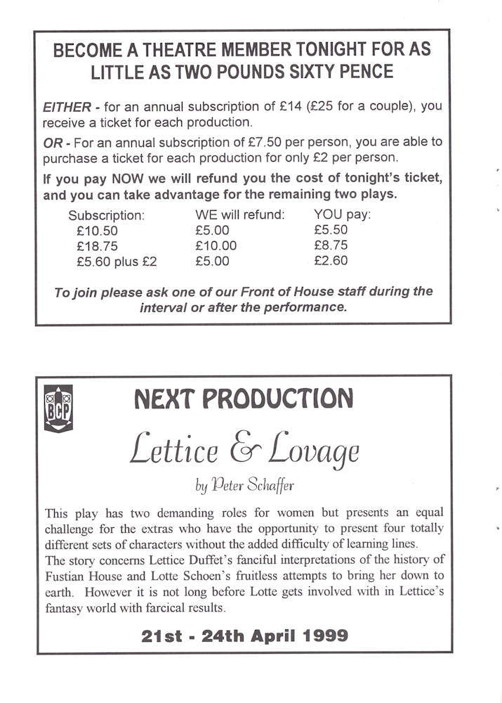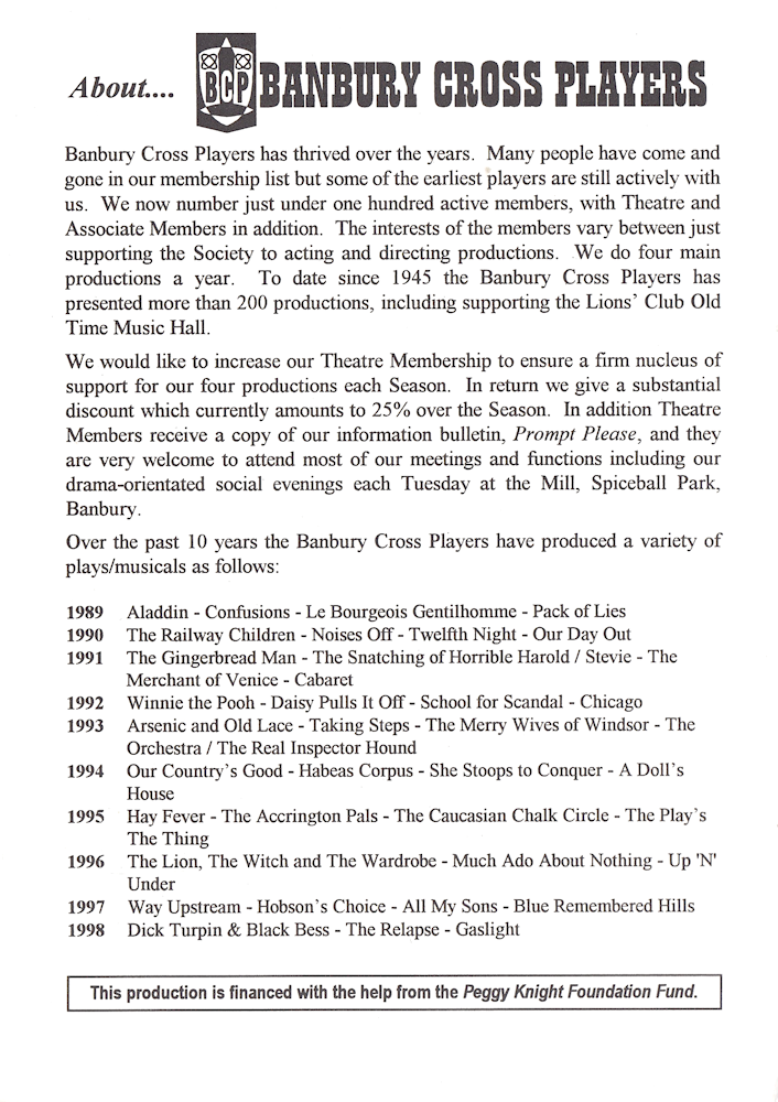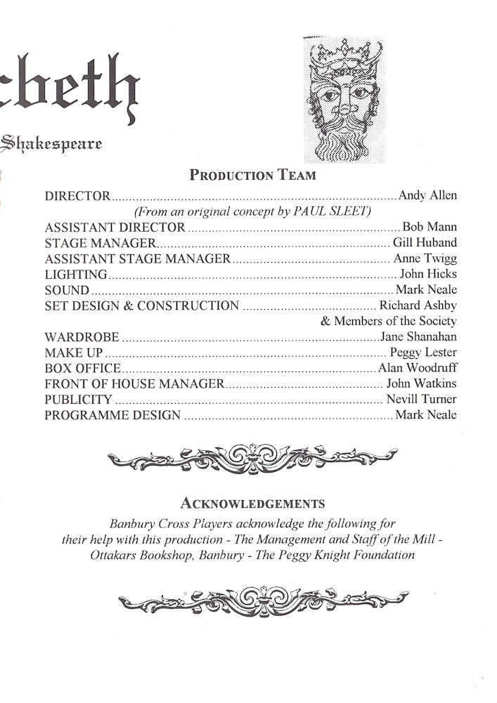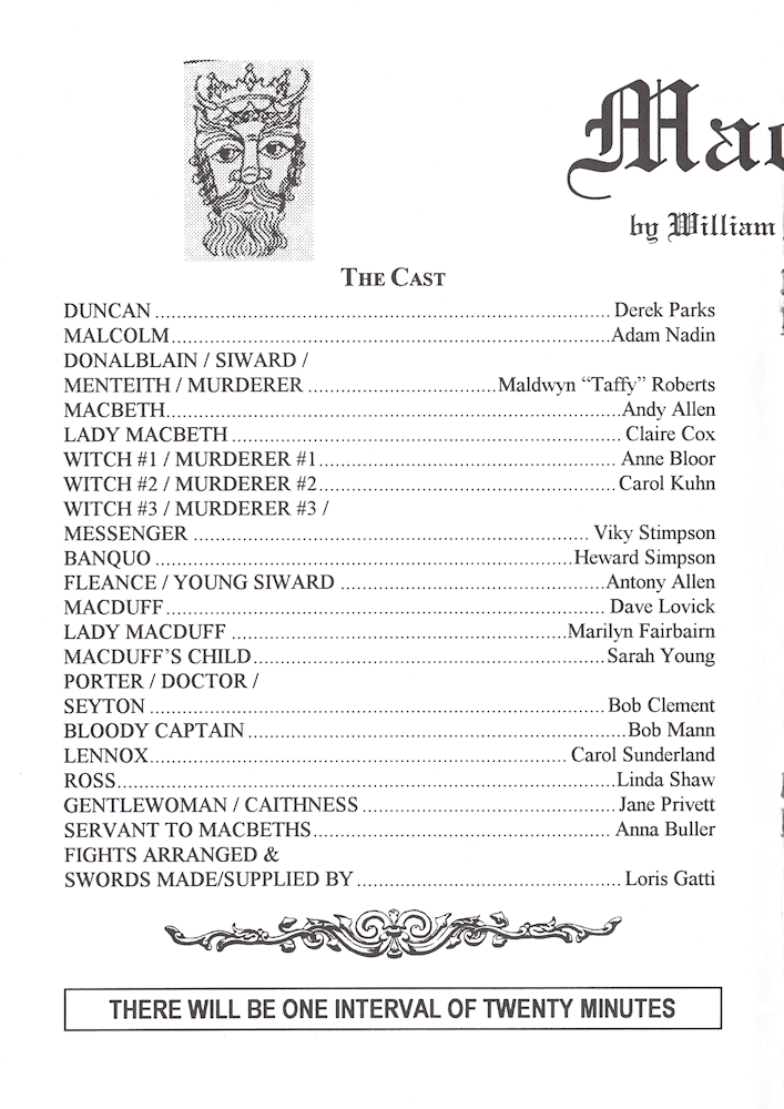 Banbury Cross Players preformed Macbeth by William Shakespeare at The Mill Arts Centre in February 1999. This was the cast: