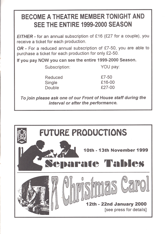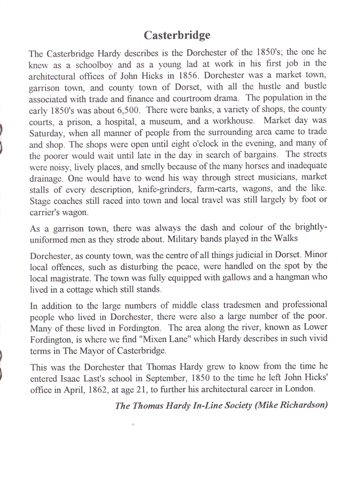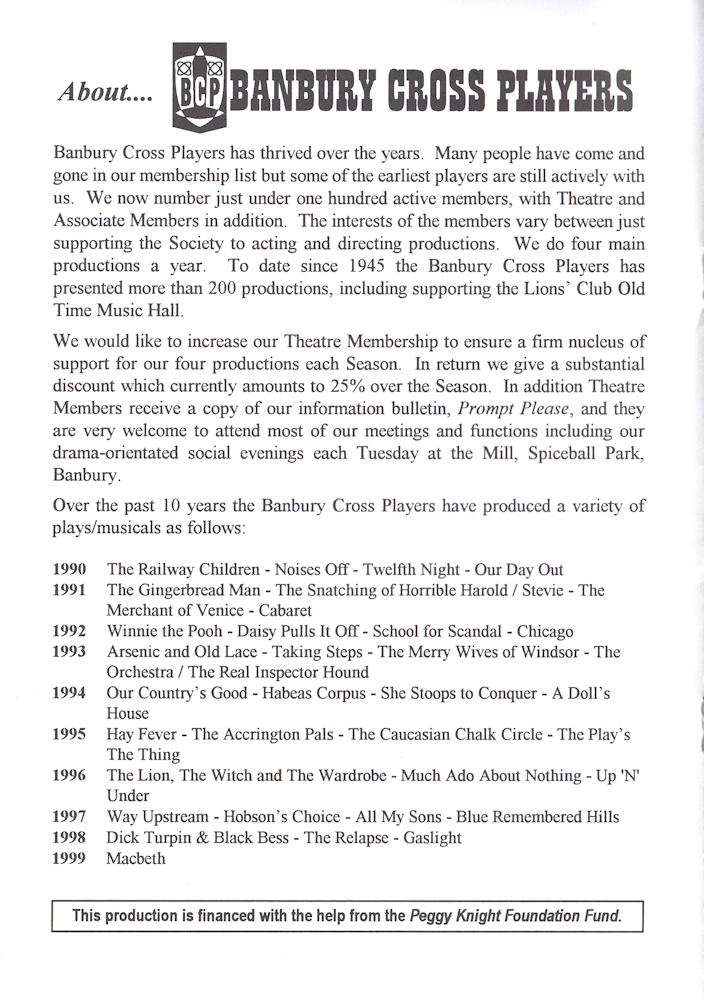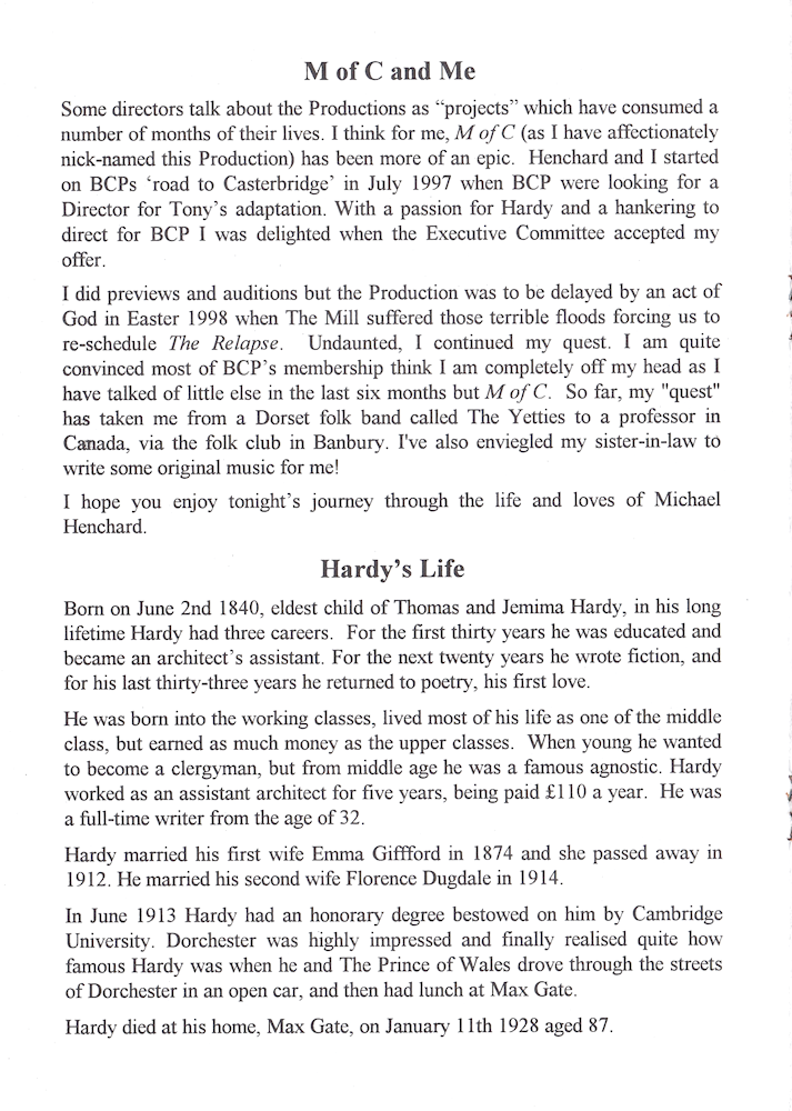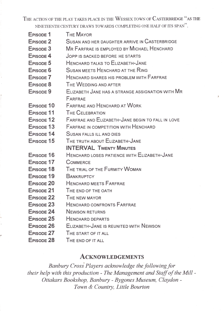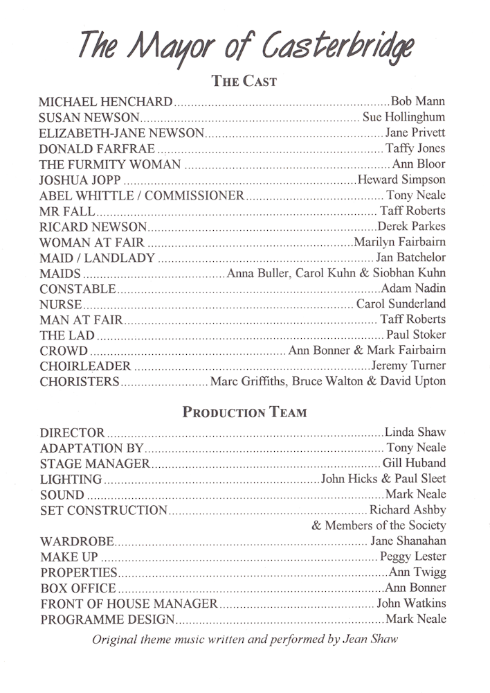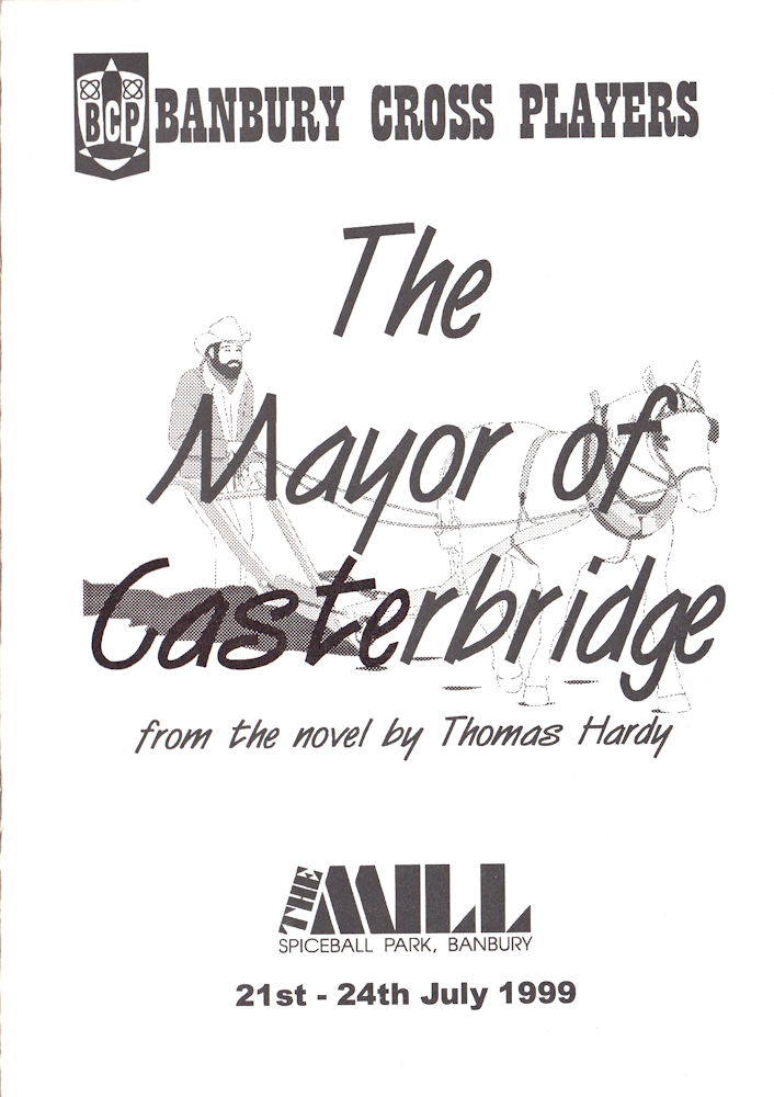 Banbury Cross Players performed The Mayor of Casterbridge from the novel by Thomas Hardy at The Mill Arts Centre in July 1999. The cast was as follows: